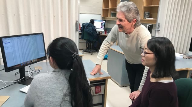 Computer sciences professor, Tony Kusalik, (on right), looks at the results of his 2nd cycle students, Yan Yan (on left) and Jinhong Shi (on bottom right). Photo: Radio-Canada/Miriane Demers-Lemay